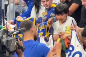 赛前勇士给场边的球迷们签名互动,场面火爆。