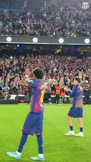 体育资讯04月12日讯 加泰德比,巴萨4-1战胜西班牙人。巴萨球员赛后谢场,全场球迷6万多球迷高喊“是的,我们可以”,鼓励球队逆转马竞。